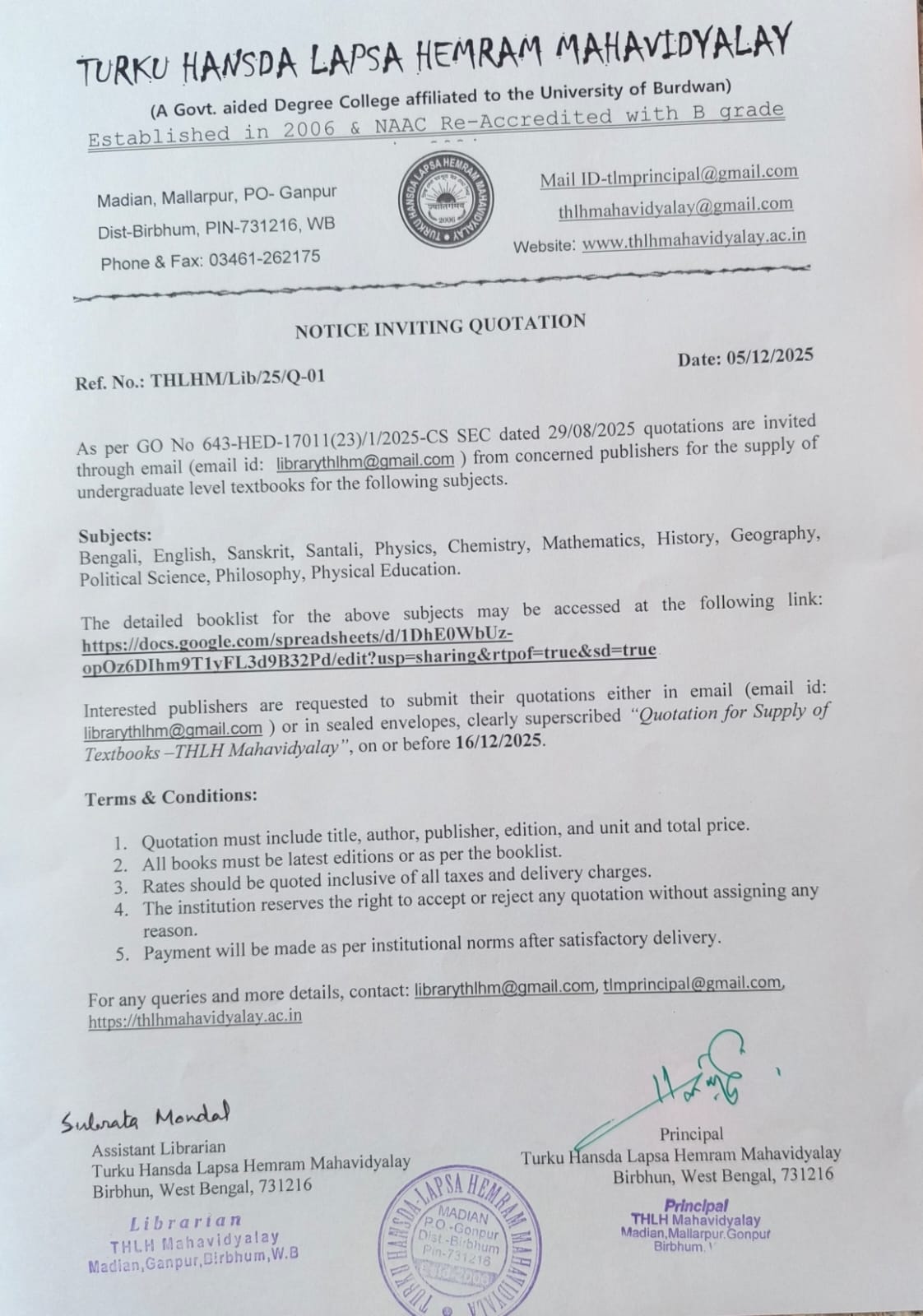Notice for Library Book Quotation